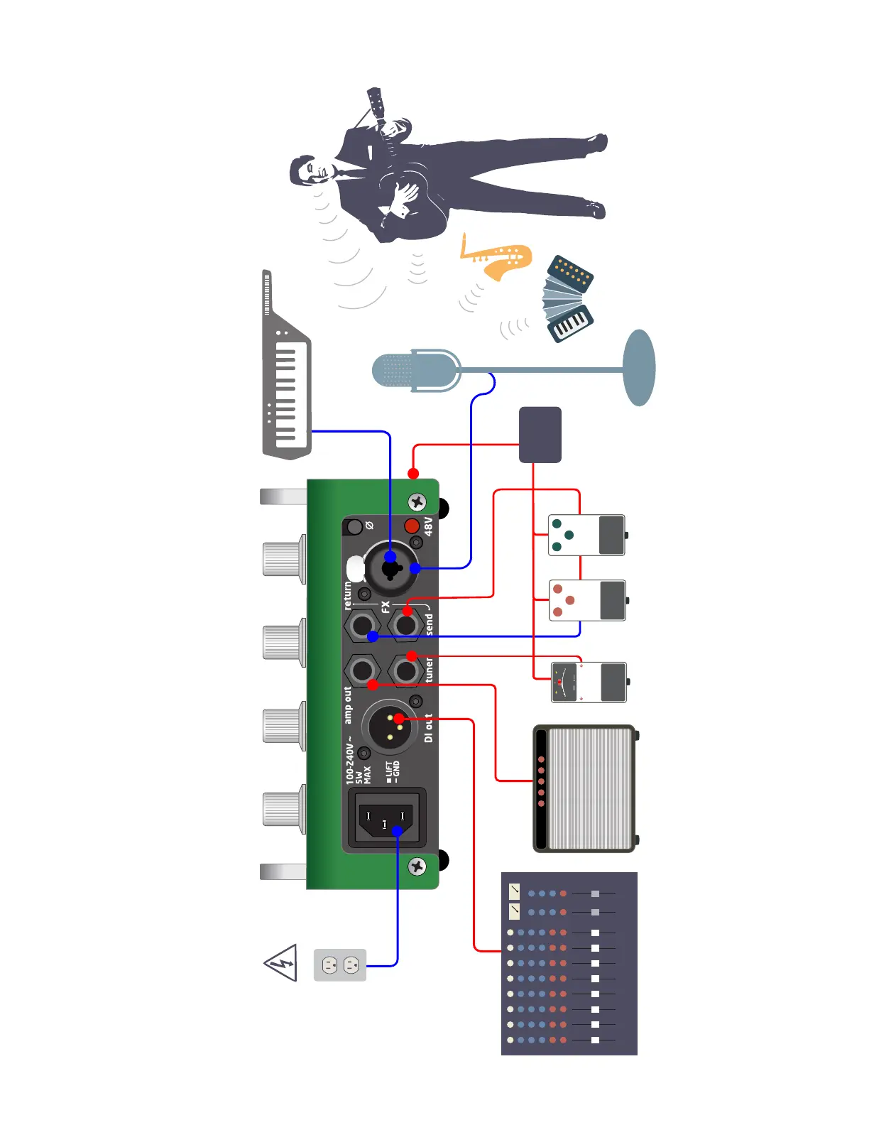 preamp. INPUT paths are shown in blue. OUTPUT paths are shown in red.