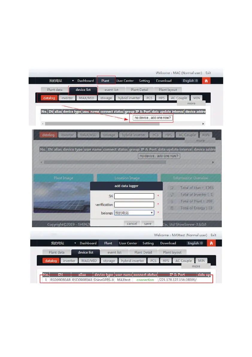 On the Plant page, click on “device list”, “datalog”, “add data logger”, enter the SN