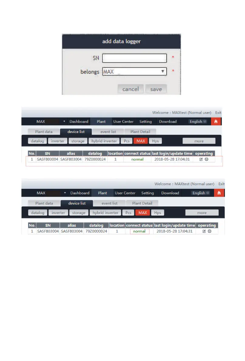 At Plant page, click device manage, then click add datalogger, input the SN and valid