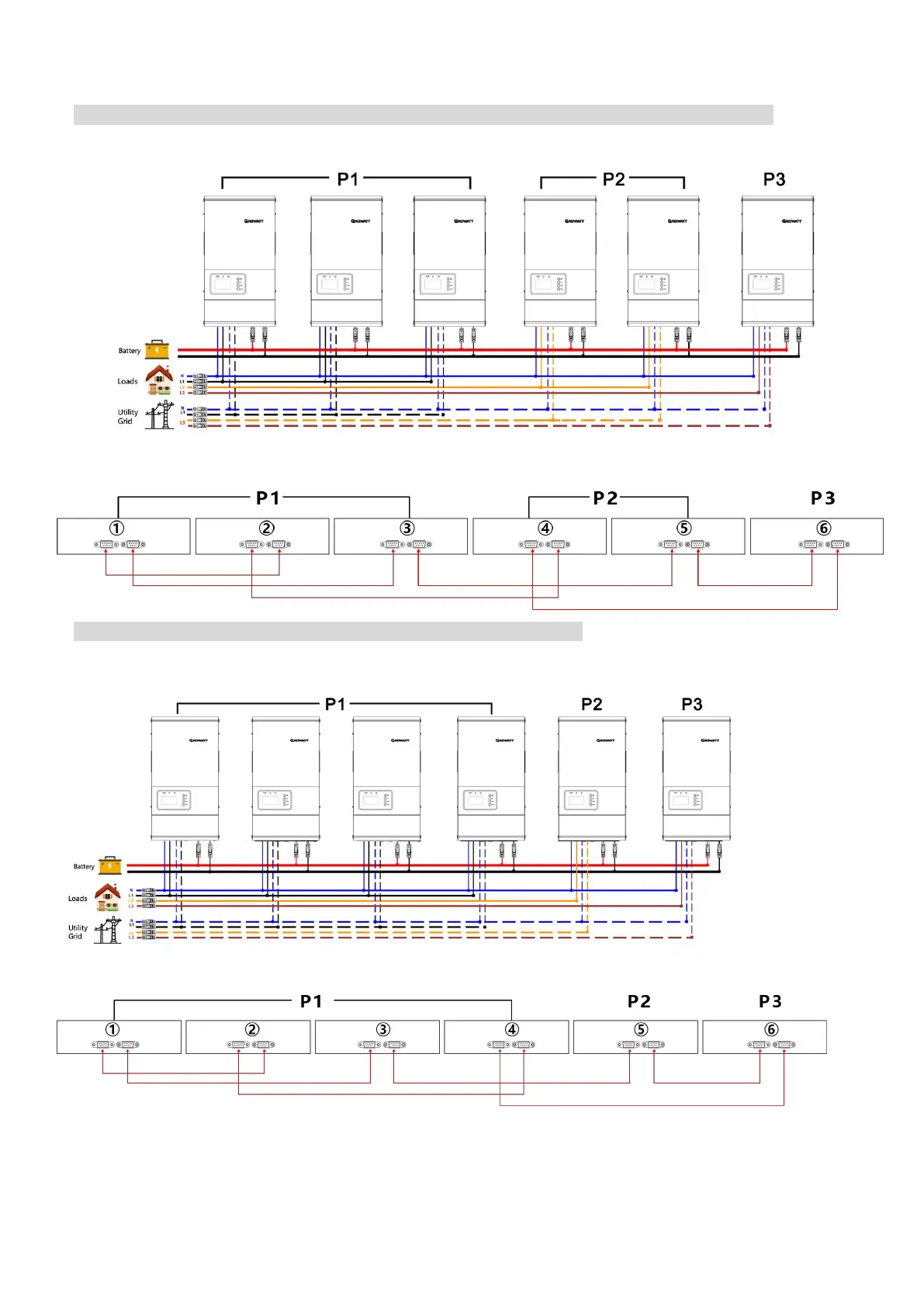 WARNING: Do not connect the current sharing cable between the inverters which are in different phases.