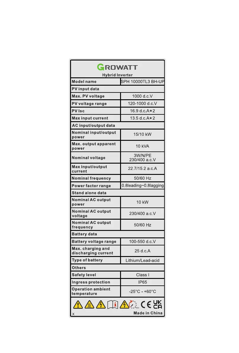 The figure below demonstrates the nameplate of SPH 10000TL3 BH-UP as an example.