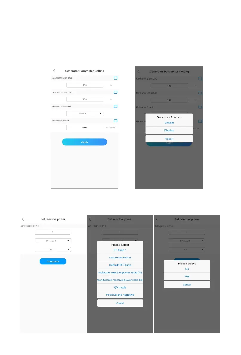 Generator function, set the Generator Start/Stop SOC and the Generator power,