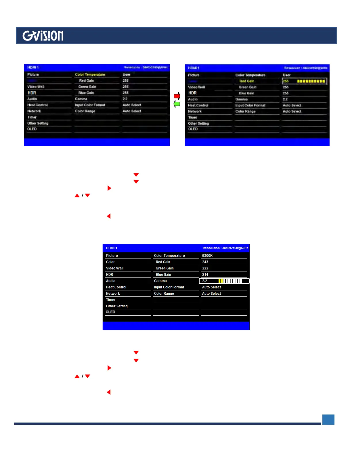 2. Press the MENU button and then button to select the Red/Blue/Green Gain.