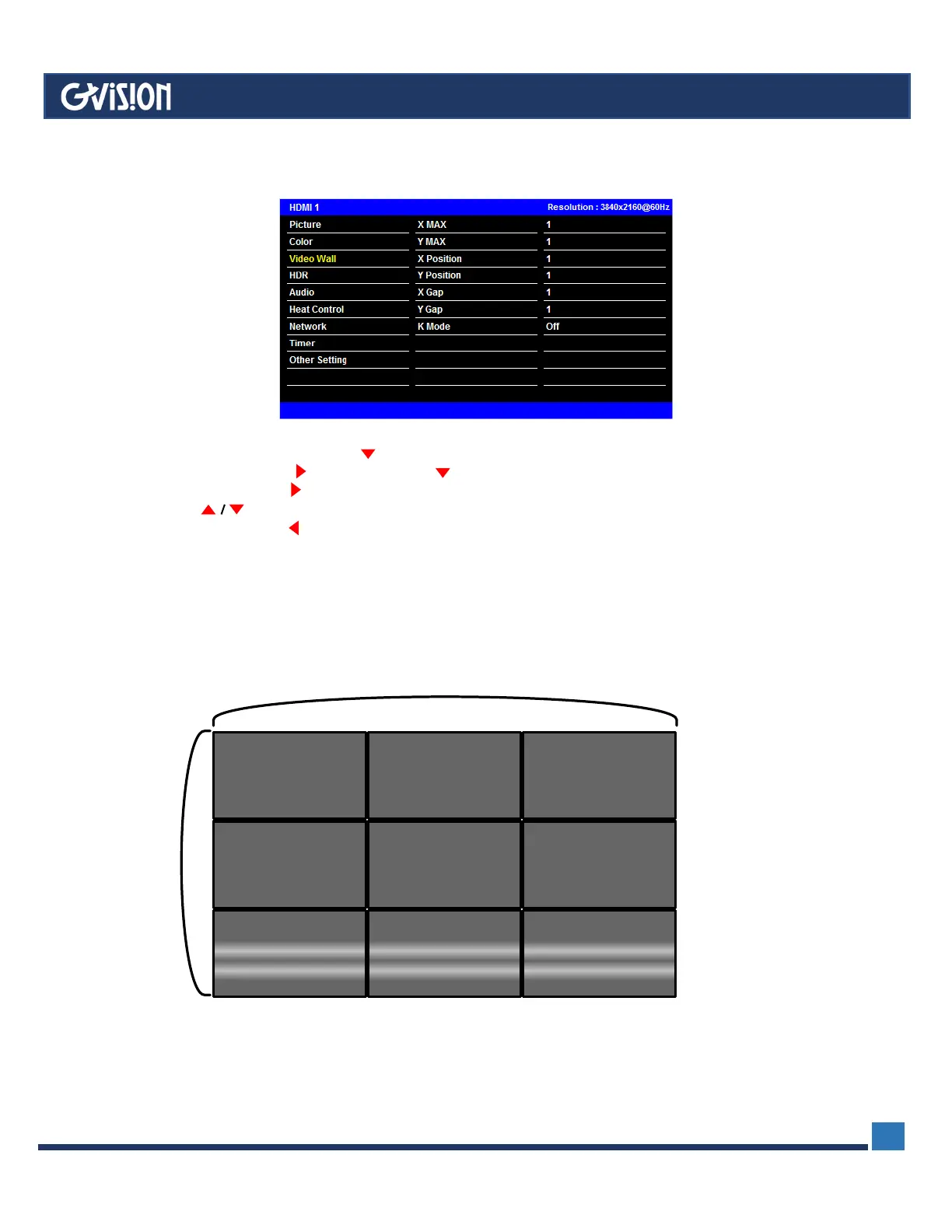 1. Press the MENU button and then button to select the Video Wall Settings.