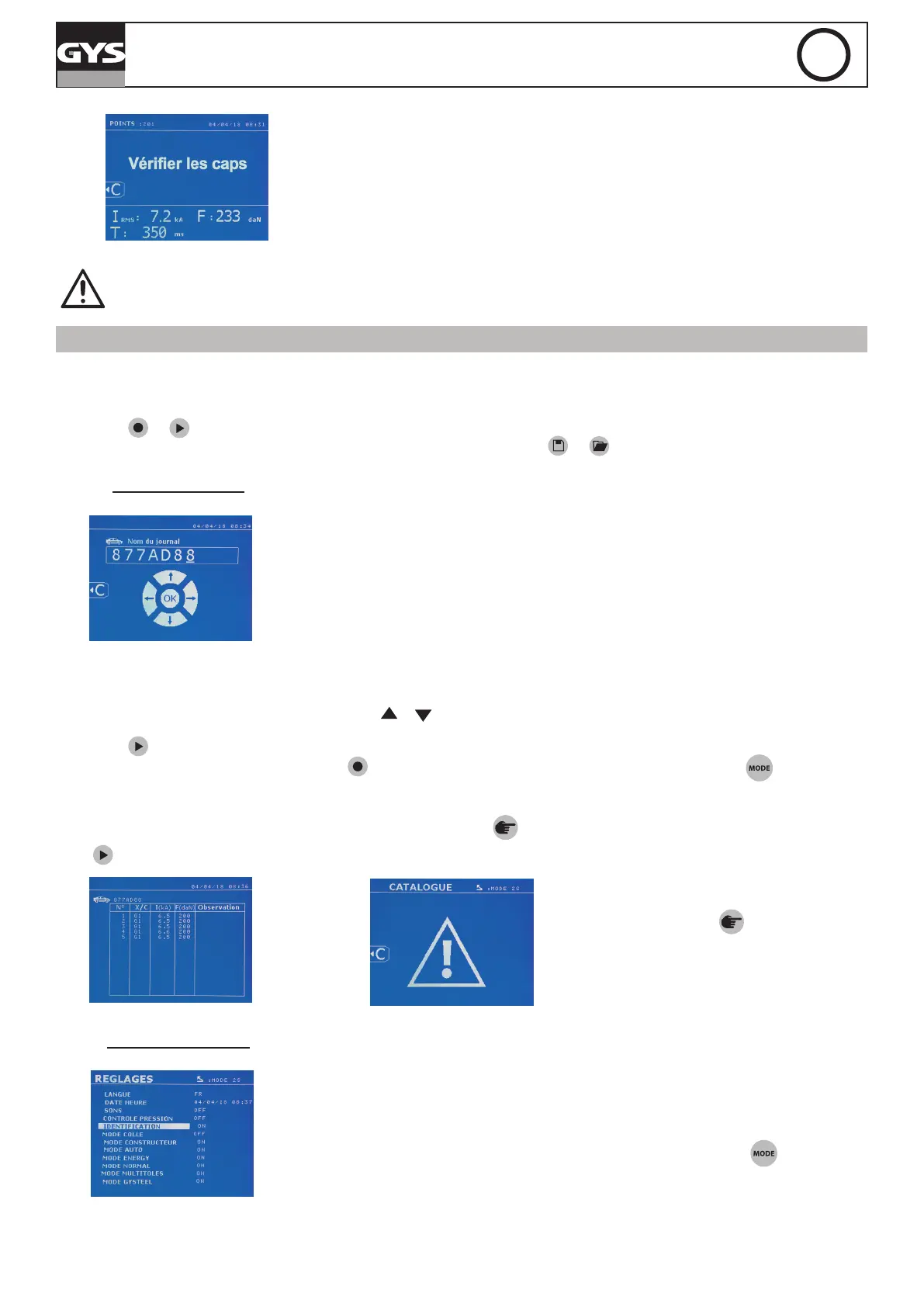 instellingen van het apparaat (intensiteit en druk). Het bevat tevens de eventuele volgende foutmeldingen die zijn verschenen tijdens het opslaan :I