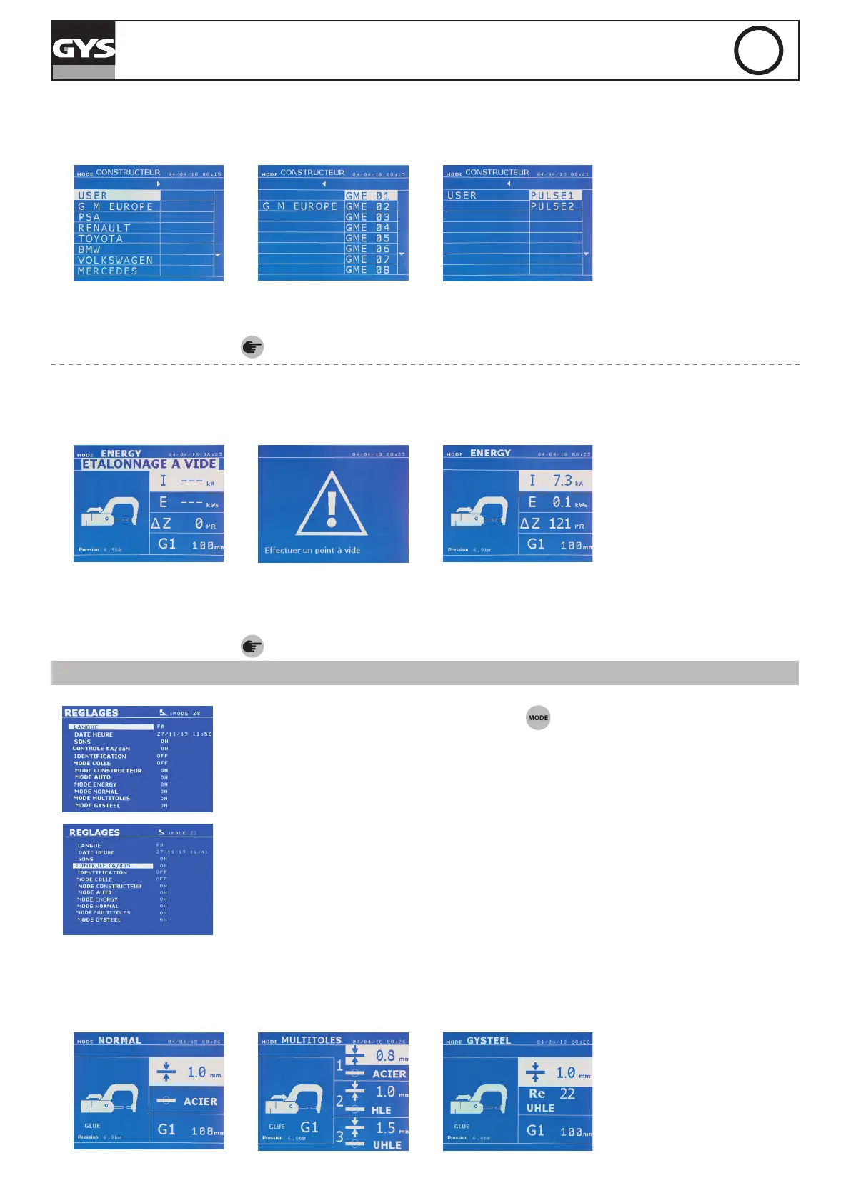 Os modos GYSTEEL, FABRICANTE, AUTO e ENERGY, NORMAL e MULTICHAPAS podem ser ativados / desativa-
