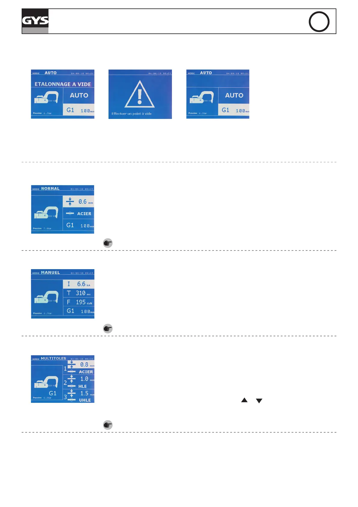 Pour pouvoir utiliser ce mode, eectuer au préalable un point à vide (sans tôles entre les électrodes), comme demandé à l’écran. Presser le bouton