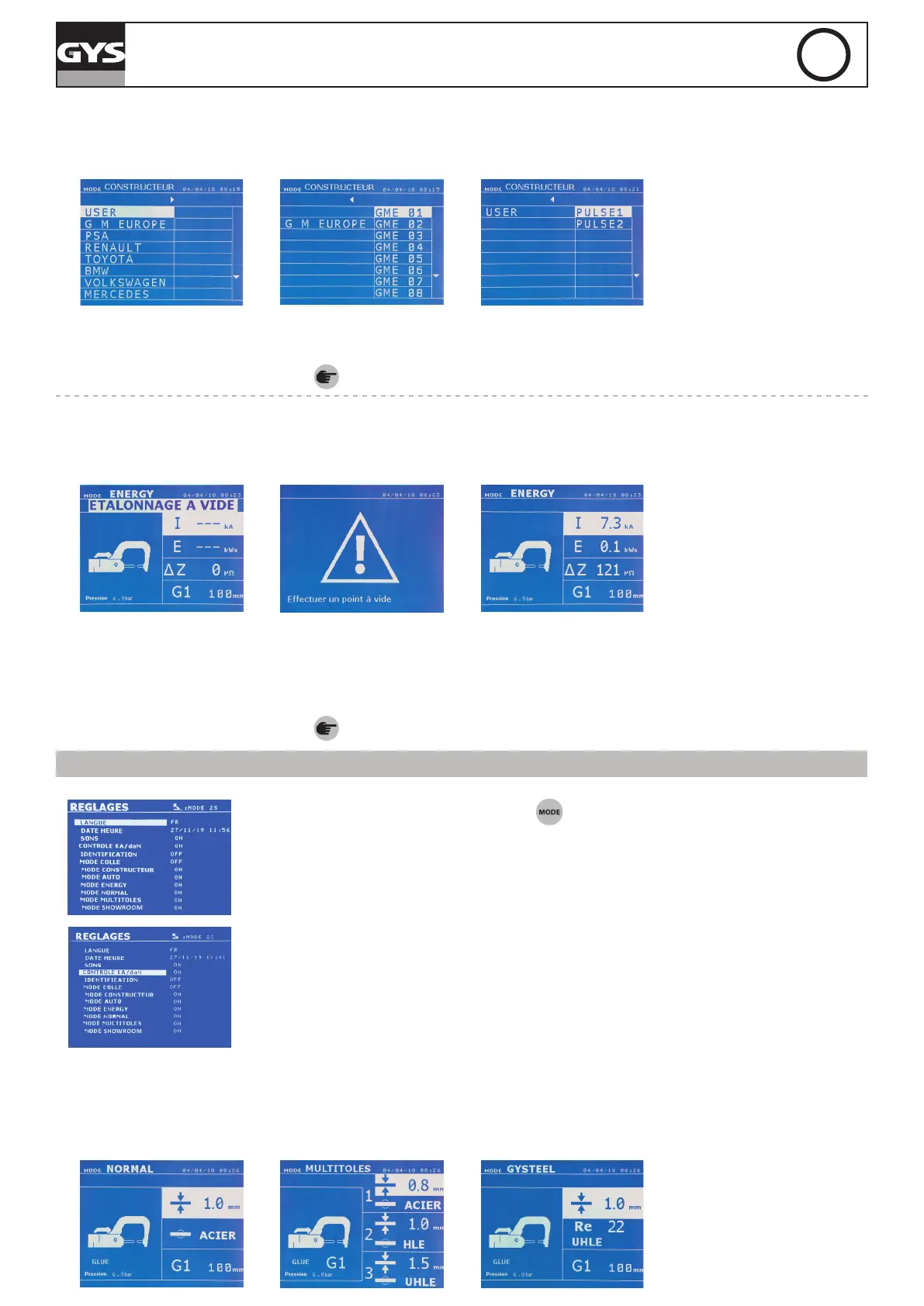 Los modos GYSTEEL, FABRICANTE, AUTO, ENERGY, NORMAL y MULTICHAPA se pueden activar / desactivar en