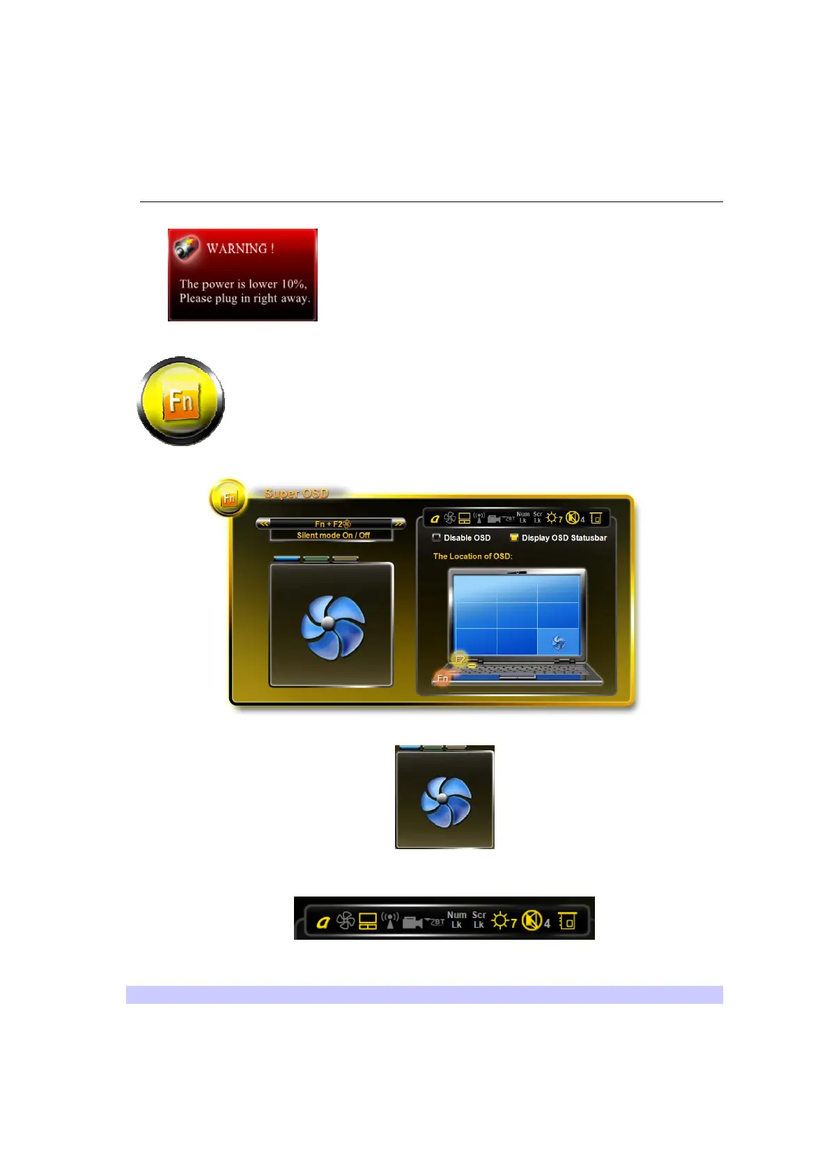 此区域显示 OSD 功能的当前状态。状态栏会自动检测您的系统连接的设备。如果图标颜色