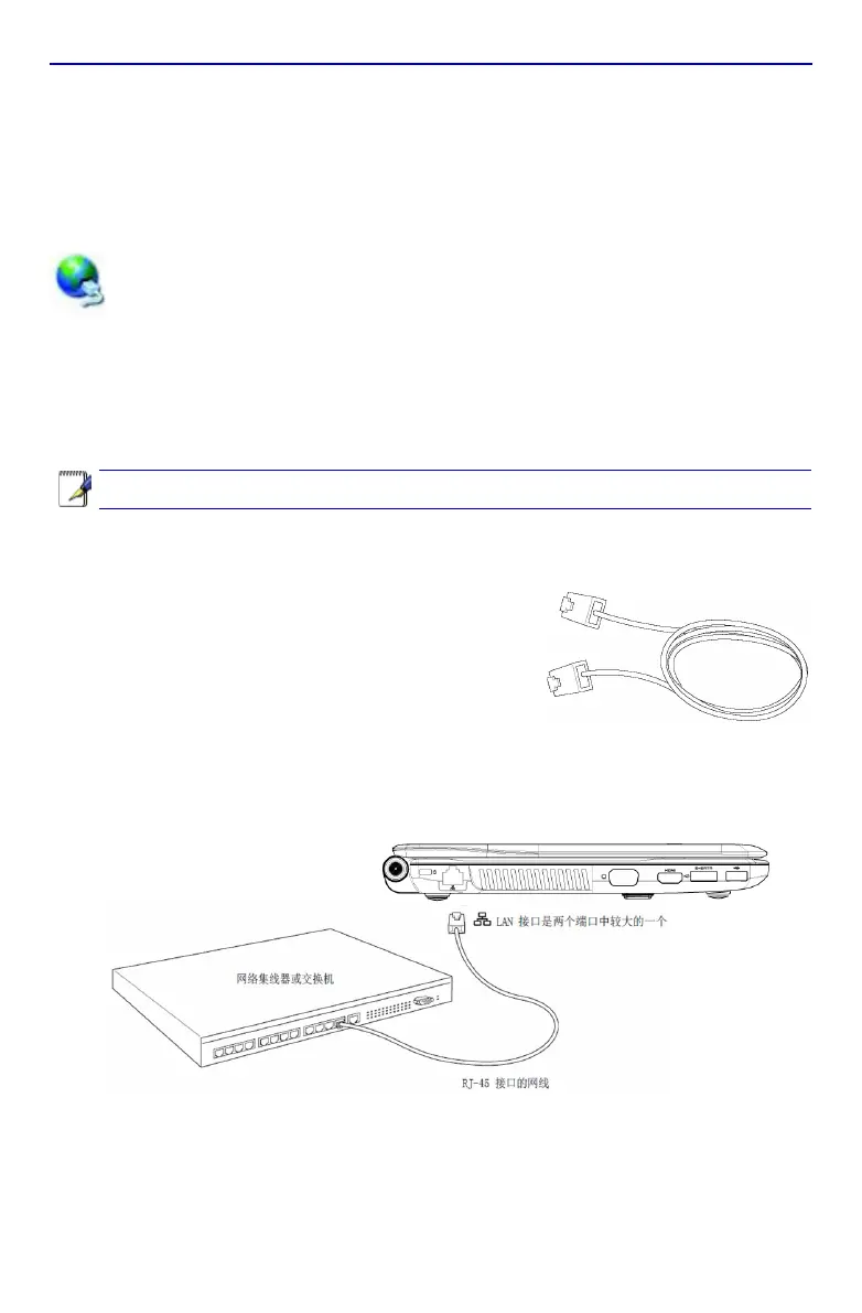 连接网络缆线(两端都有 RJ-45 接口)一端到笔记本电脑的网络接口,另一端到