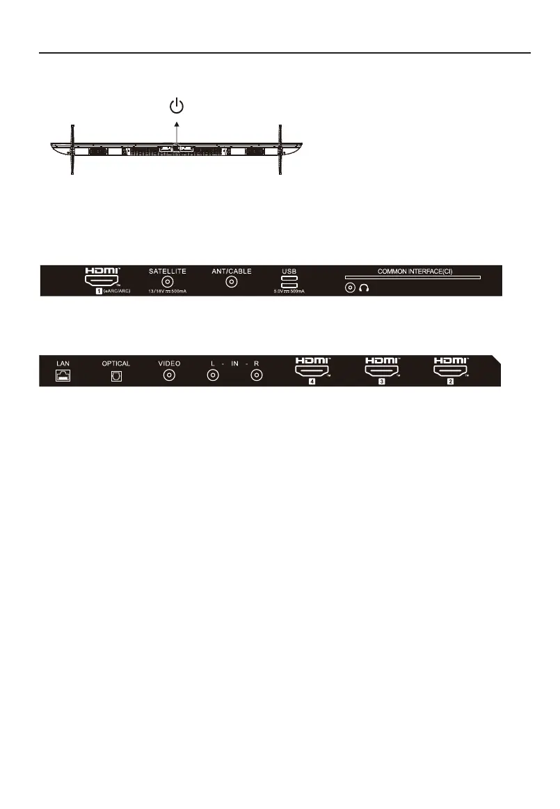 HDMI1(eARC/ARC), SATELLITE, ANT IN (АНТЕНА/КАБЕЛ), USB, СЛУШАЛКИ, ОБЩ ИНТЕРФЕЙС (CI).