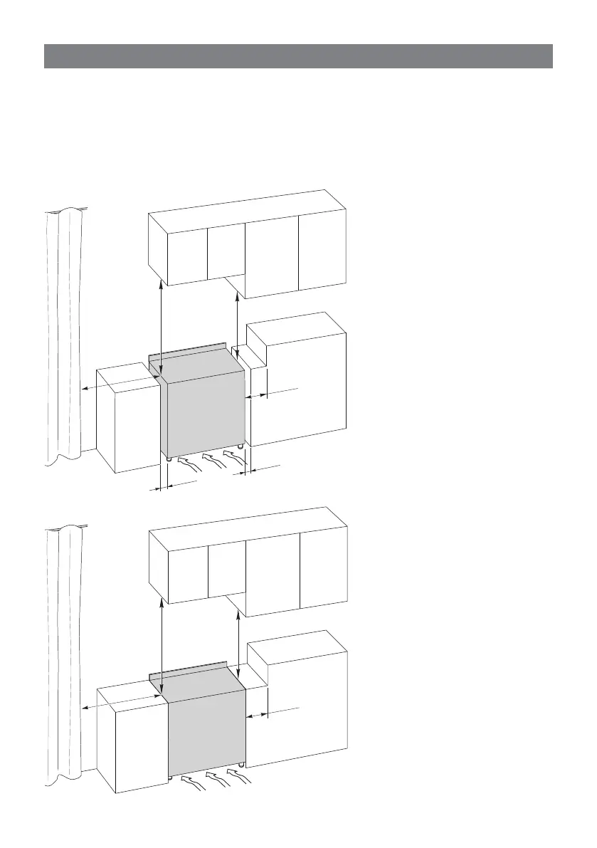 The cooker must be kept no less than 200 mm away from any side wall which exceed the