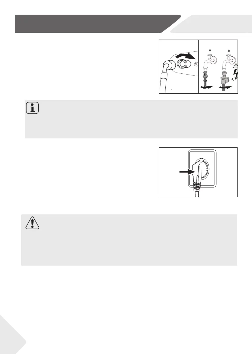 ▶ Ensure always that all connections (power supply, drain and fresh water hose) are fi rm,
