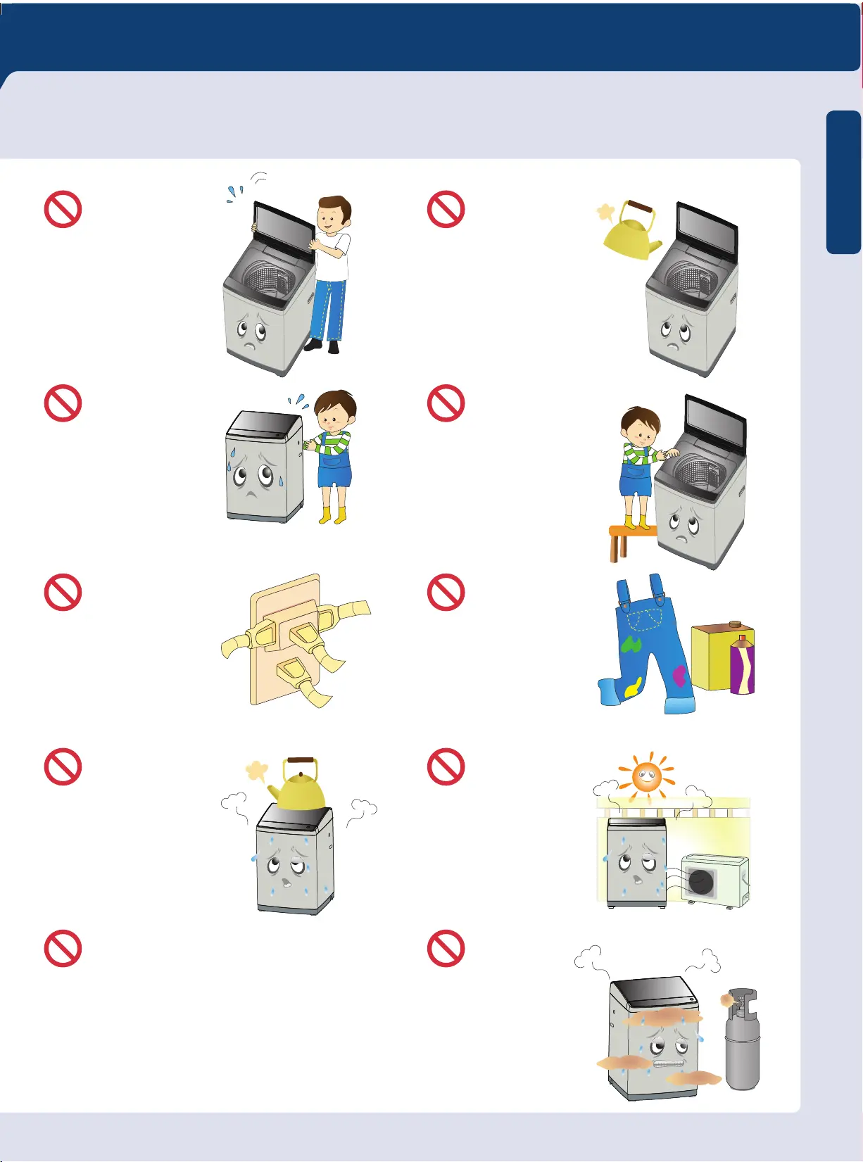 禁止洗涤雨衣、车罩等防水性衣物,以免异常振动或