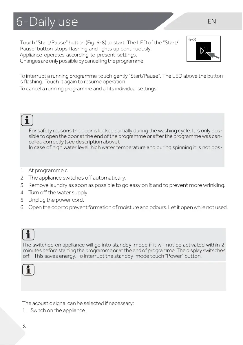 Touch “Start/Pause” button to interrupt the running programme select a new progra-