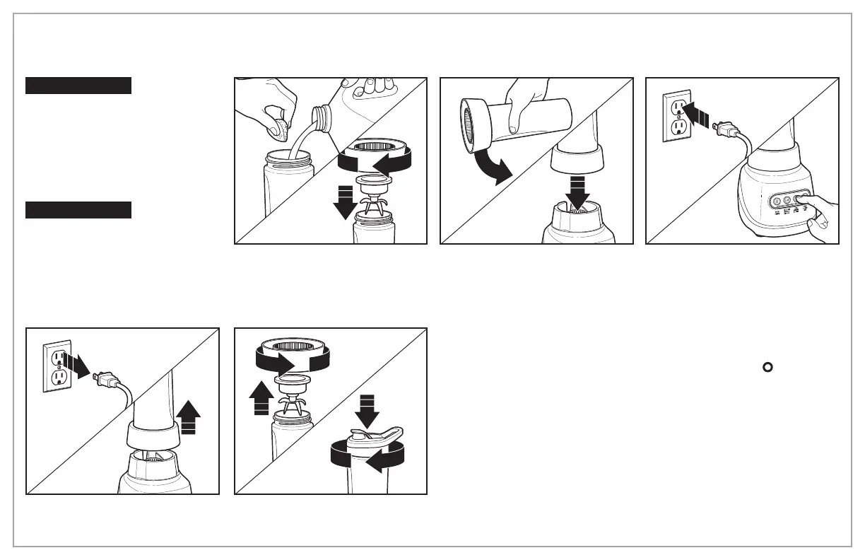 3. Enchufe en el tomacorriente. Sostenga la jarra de viaje en su lugar mientras esté licuando. Presione el botón ON (I) o