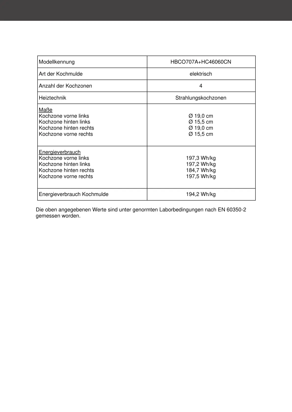 Die oben angegebenen Werte sind unter genormten Laborbedingungen nach EN 60350-2