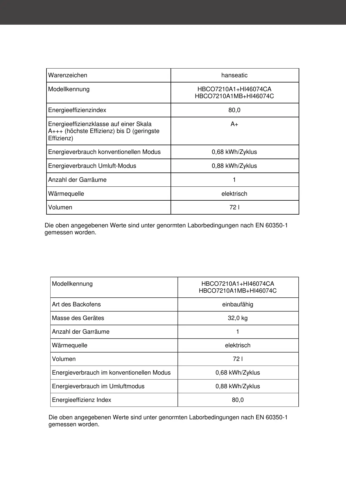 Die oben angegebenen Werte sind unter genormten Laborbedingungen nach EN 60350-1