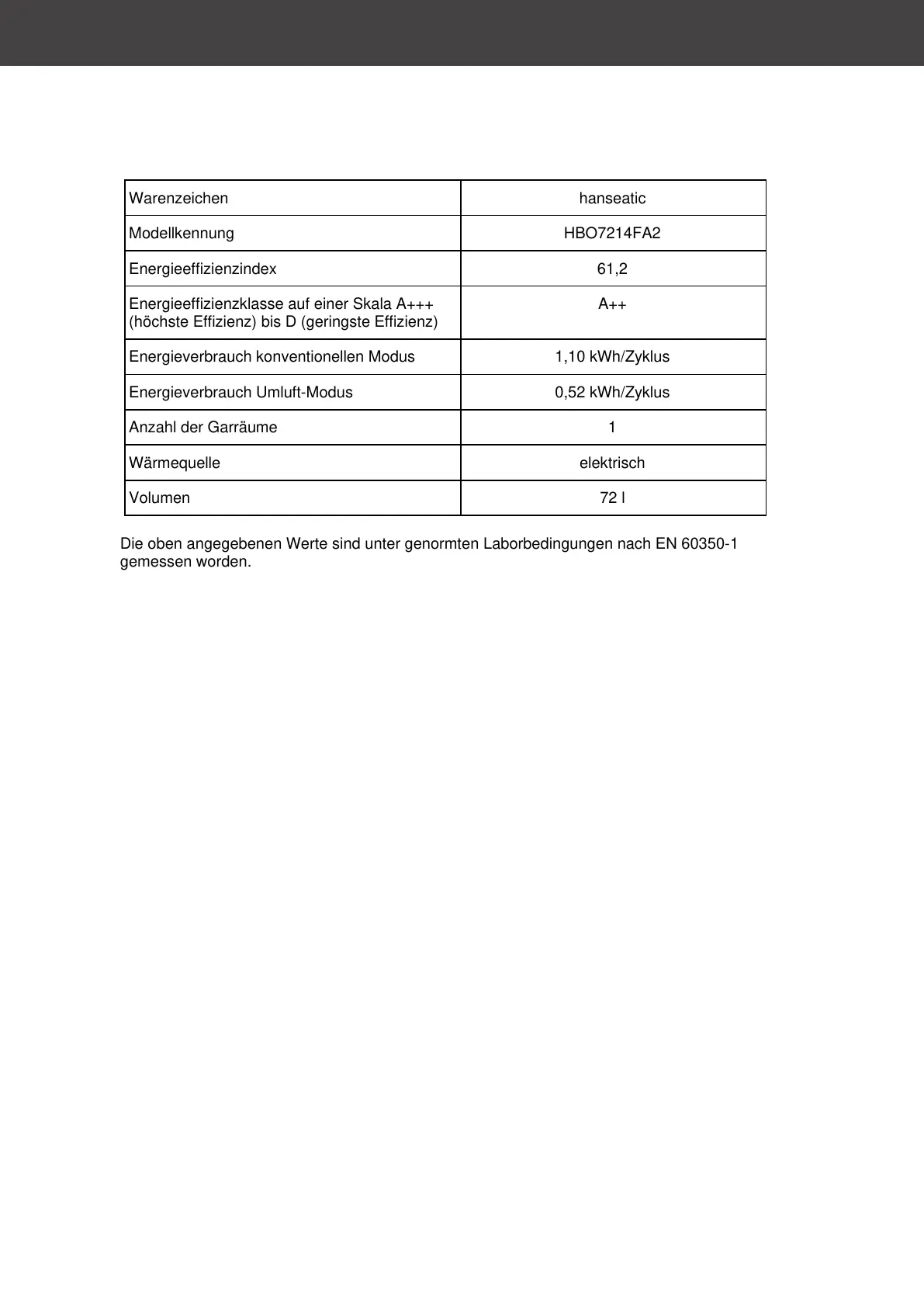 Die oben angegebenen Werte sind unter genormten Laborbedingungen nach EN 60350-1