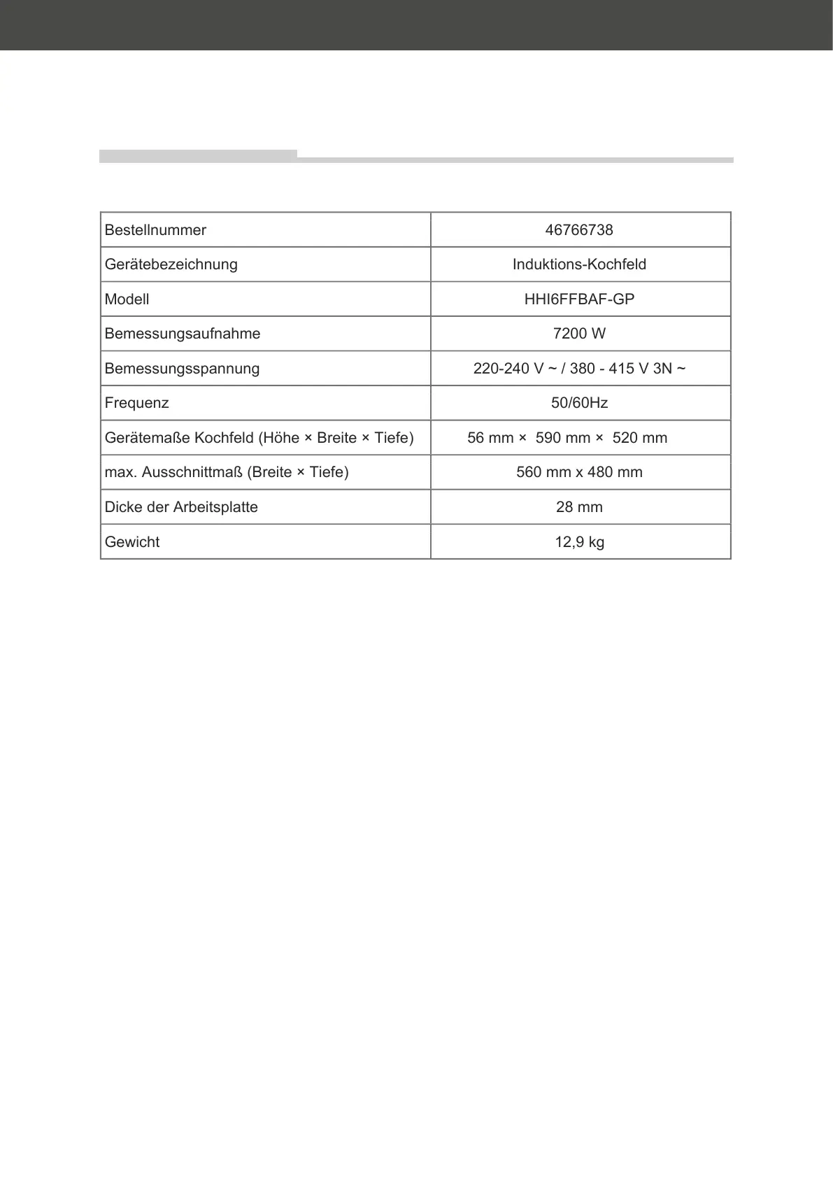 Gerätemaße Kochfeld (Höhe × Breite × Tiefe)