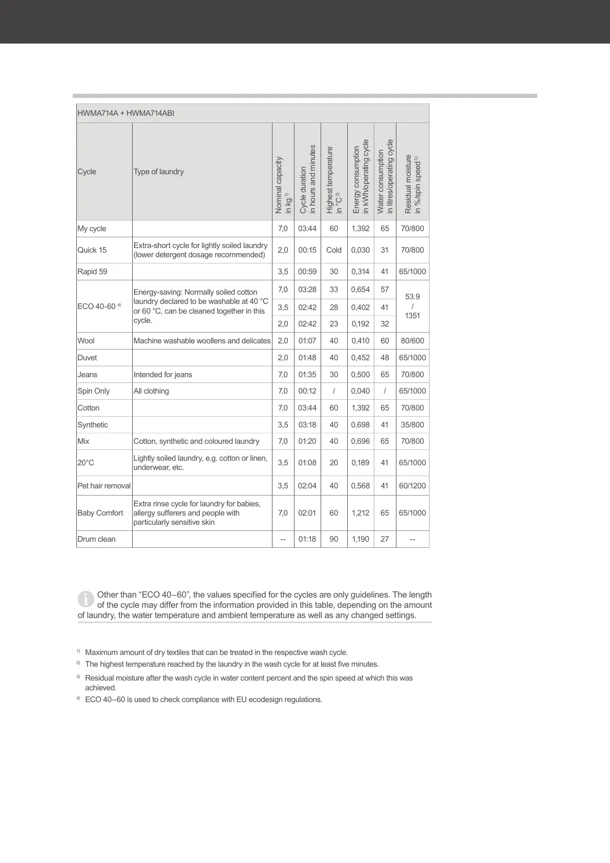 Other than “ECO 40–60”, the values specified for the cycles are only guidelines. The length
