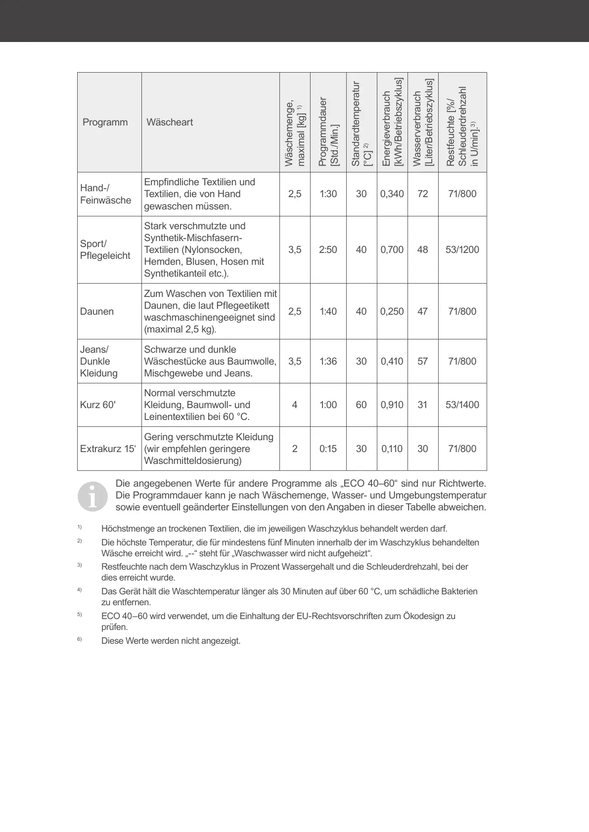 Die angegebenen Werte für andere Programme als „ECO 40–60“ sind nur Richtwerte.