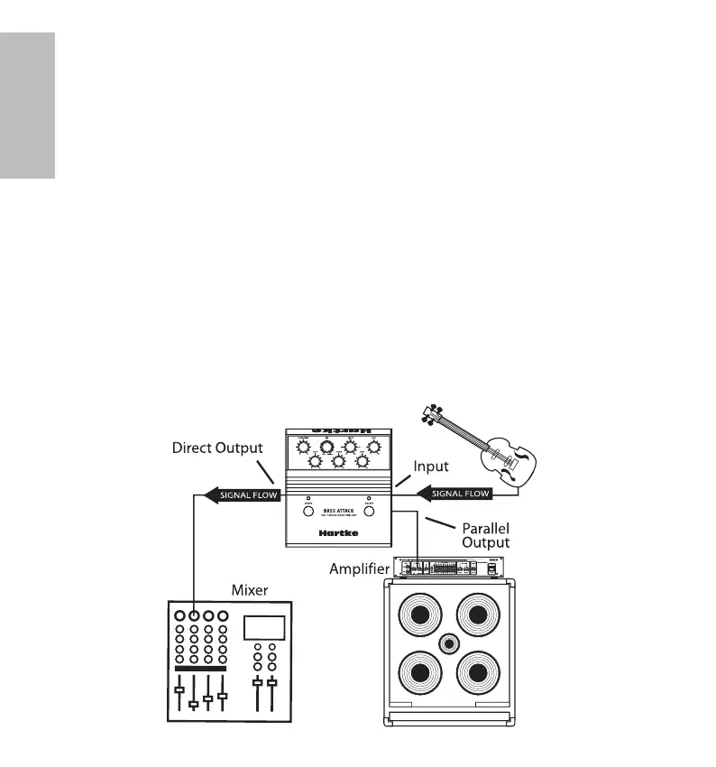 • Connect Bass Attack’s PARALLEL OUTPUT to the input of the guitar or bass amplifier.