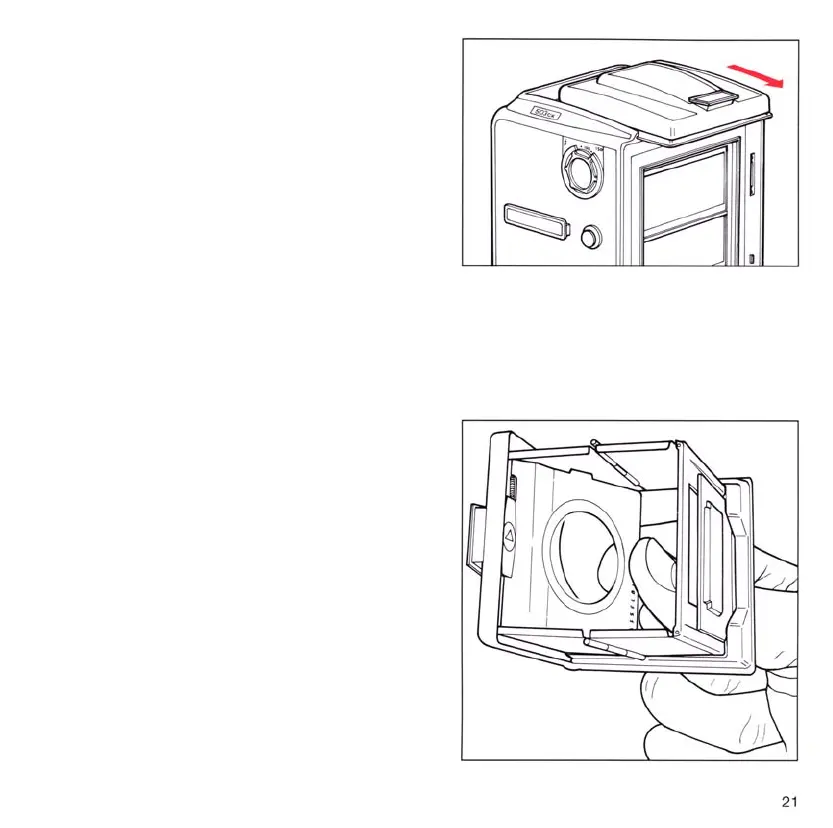 Remove the focusing hood from the camera and open