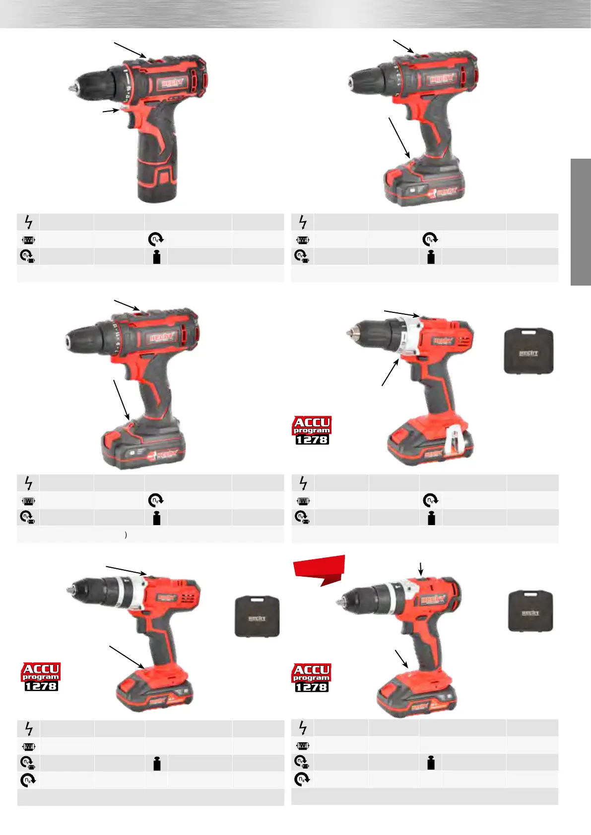 2 speed, 2× battery, quick charger (1 h), 6 pcs screw bits, 6 pcs drill bits, magnetic bit