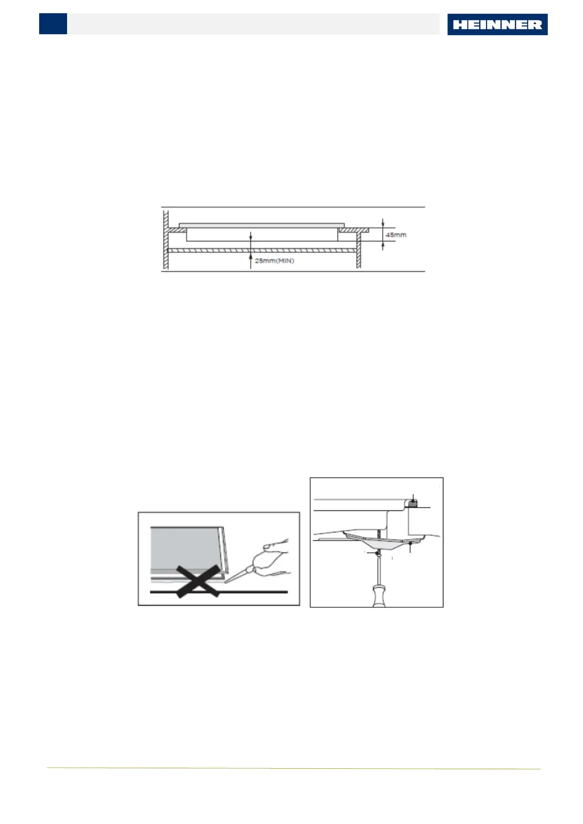• Un spațiu de 400 mm între suprafețele plitei, cu condiția ca partea inferioară a suprafeței orizontale să