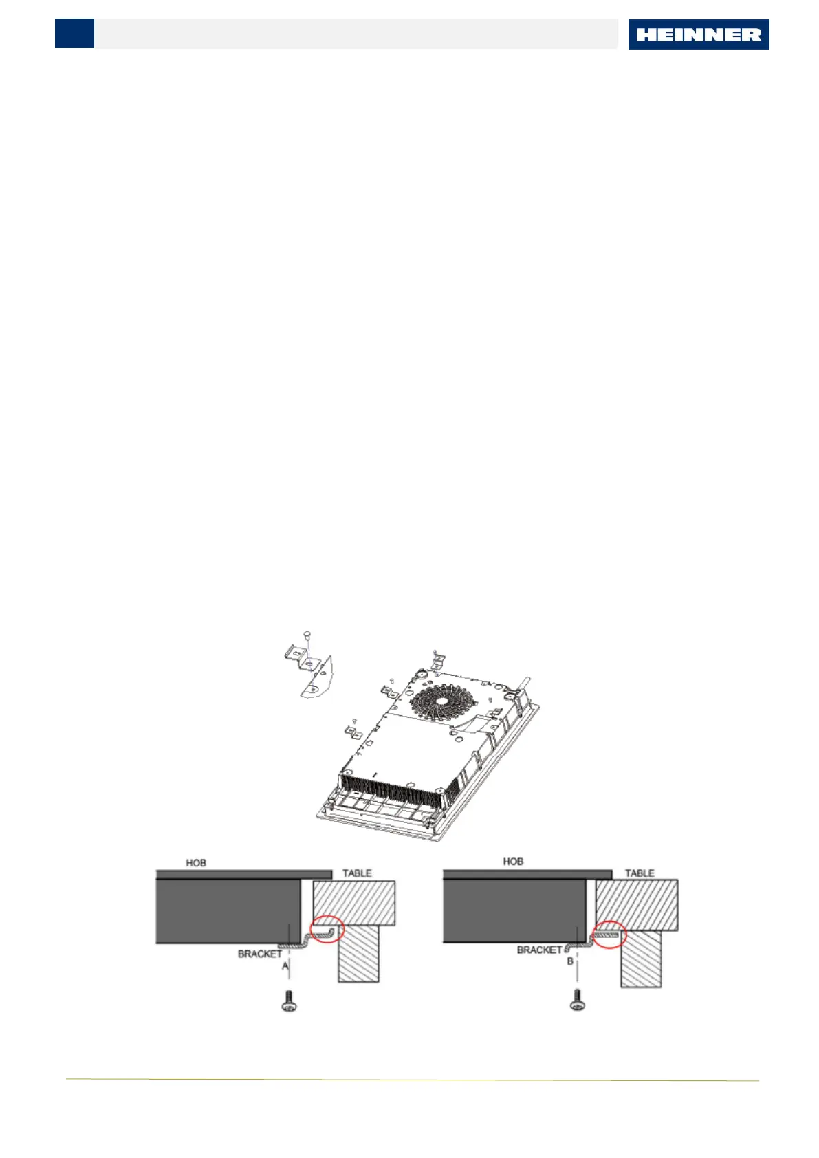 Fix the hob on the work surface by inserting 4 brackets on the bottom of hob (see picture) before