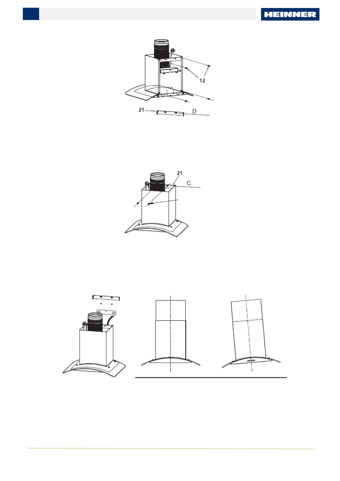 Conectați suportul de fixare a coșului de fum 21 și coșul de fum cu 2 șuruburi 12.