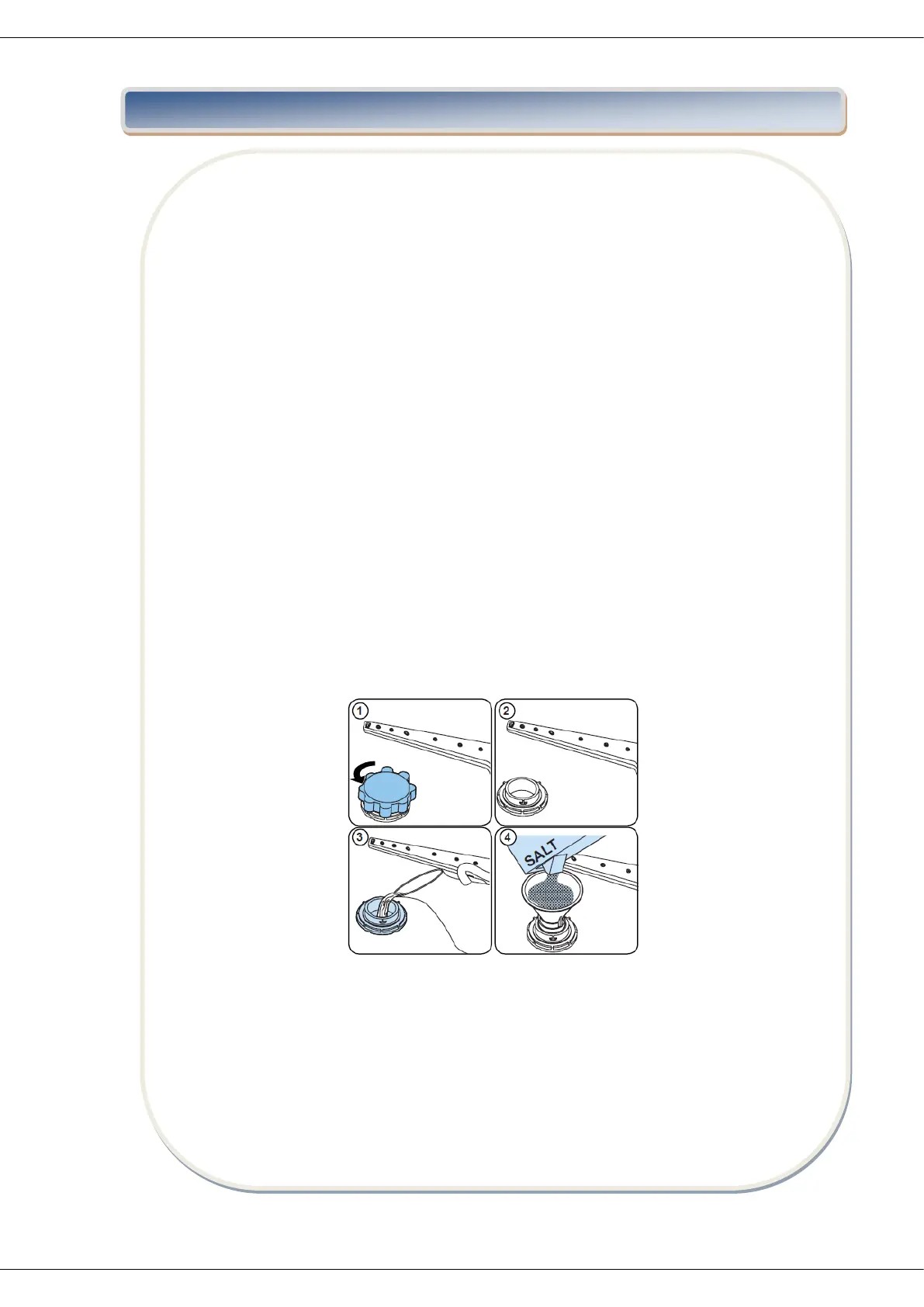 At first use, fill the compartment with 1 kg salt and water (3) until it is almost overflowing. If
