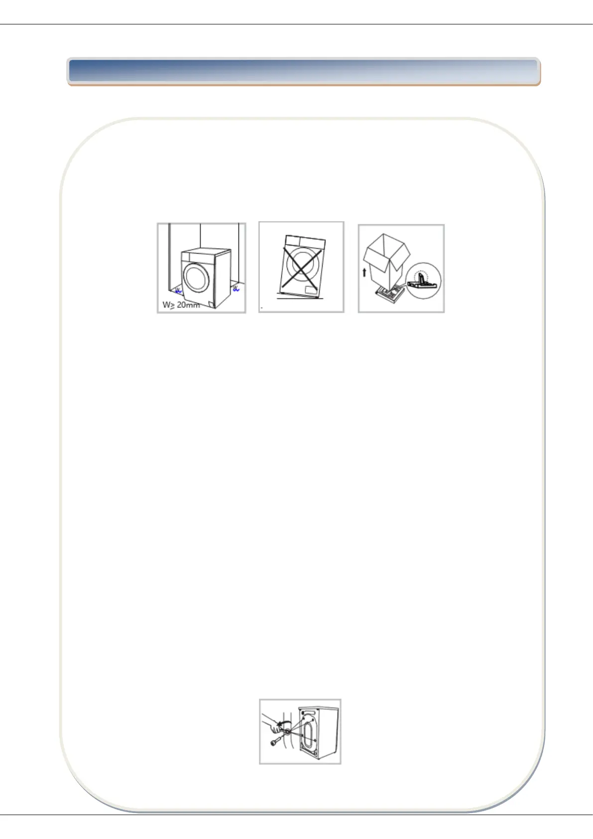 2. Ridicați mașina de spălat și îndepărtați ambalajul de la baza acesteia. Asigurați-vă că