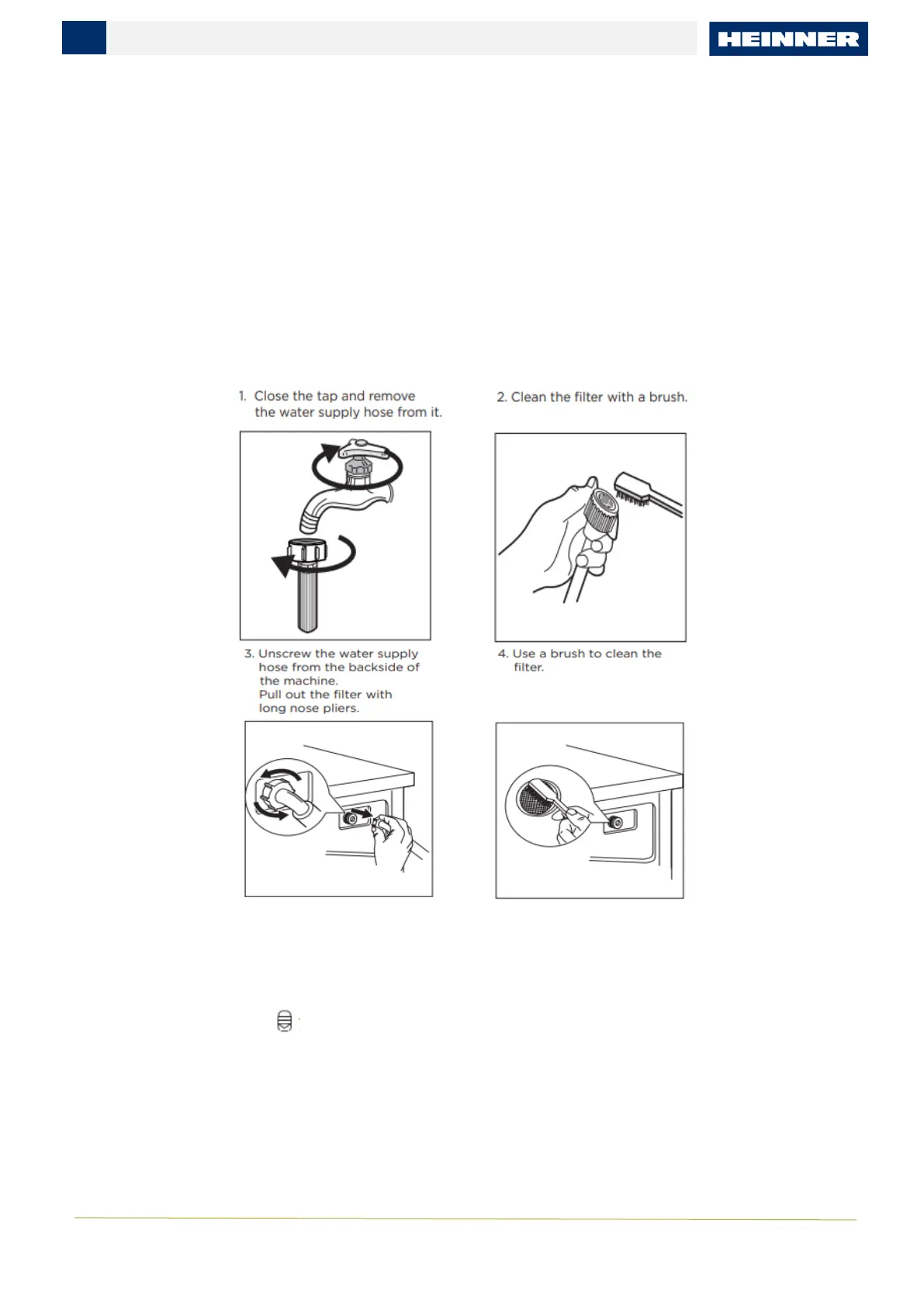 5. Reinstall the filter to the water inlet and reconnect the water supply hose.