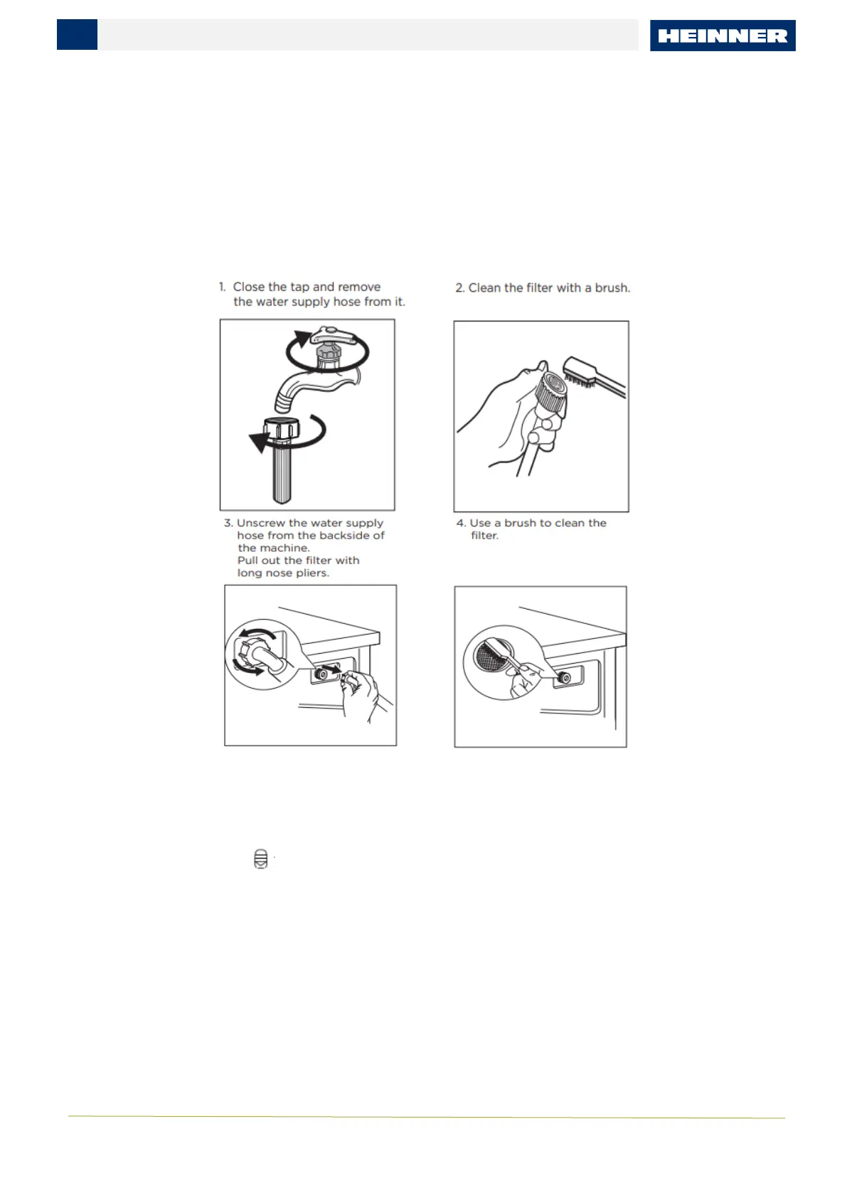 5. Reinstall the filter to the water inlet and reconnect the water supply hose.