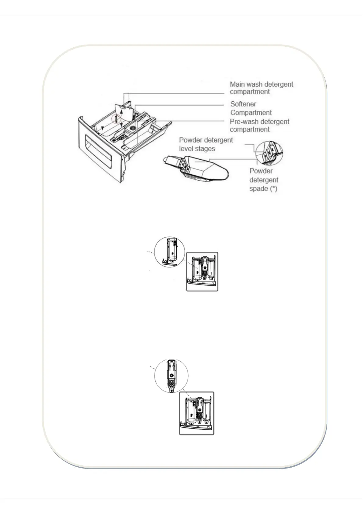 In this compartment, only materials like detergent (liquid or powder), lime preventer and