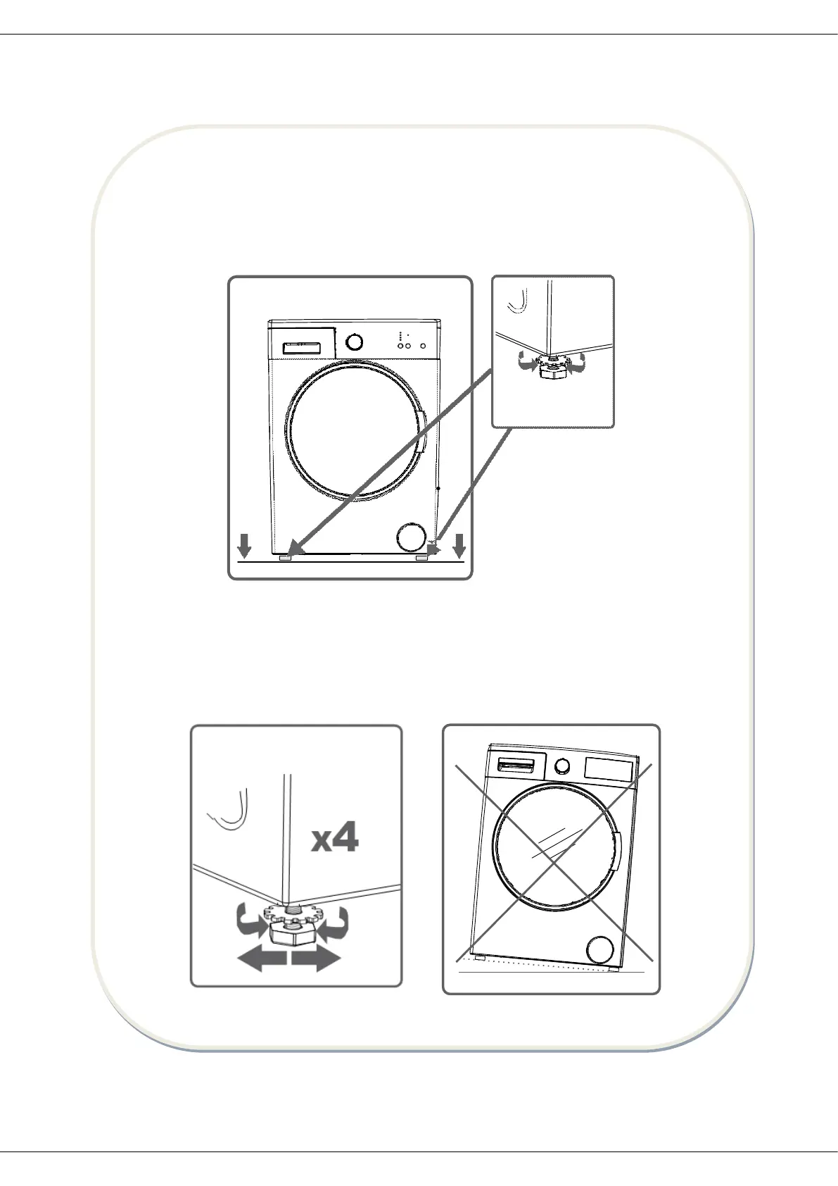 Ajustaţi poziţia picioruşelor în sus şi jos prin rotirea lor.
