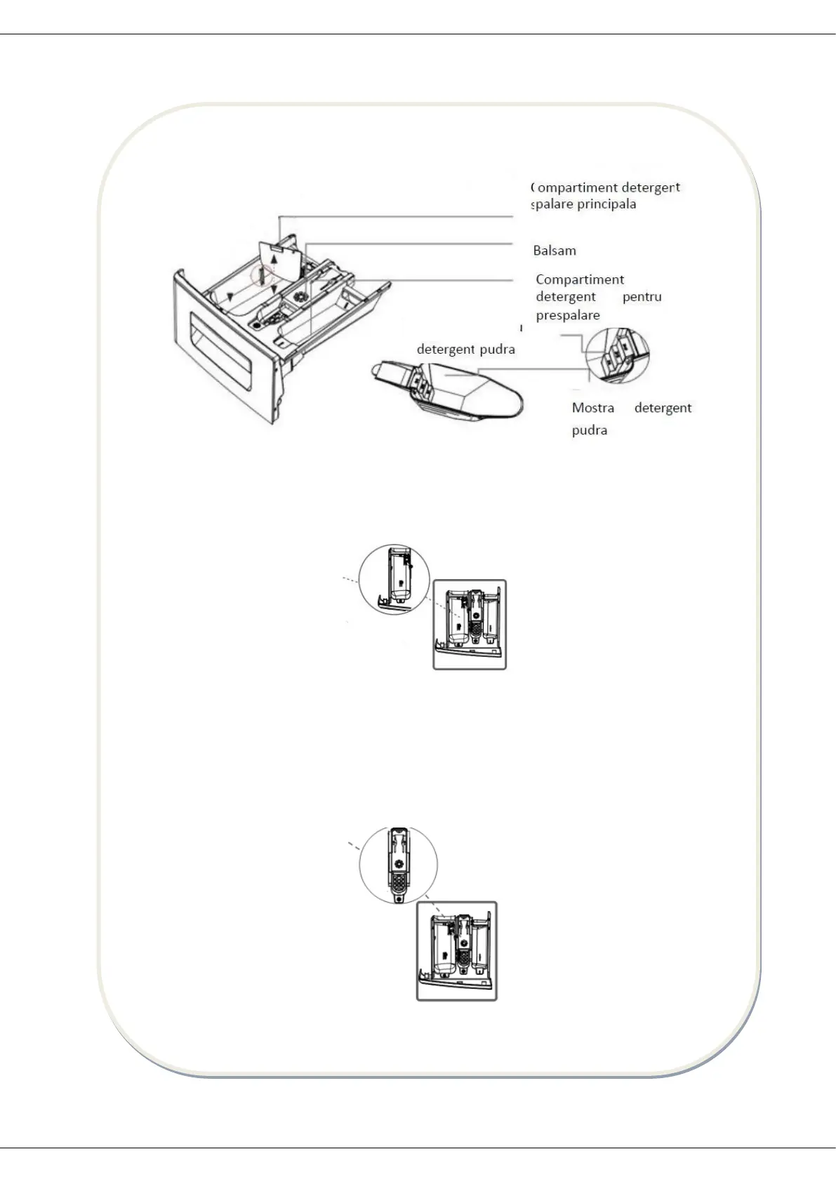 În acest compartiment, doar materialele cum ar fi detergentul (lichid sau pudră), soluţie