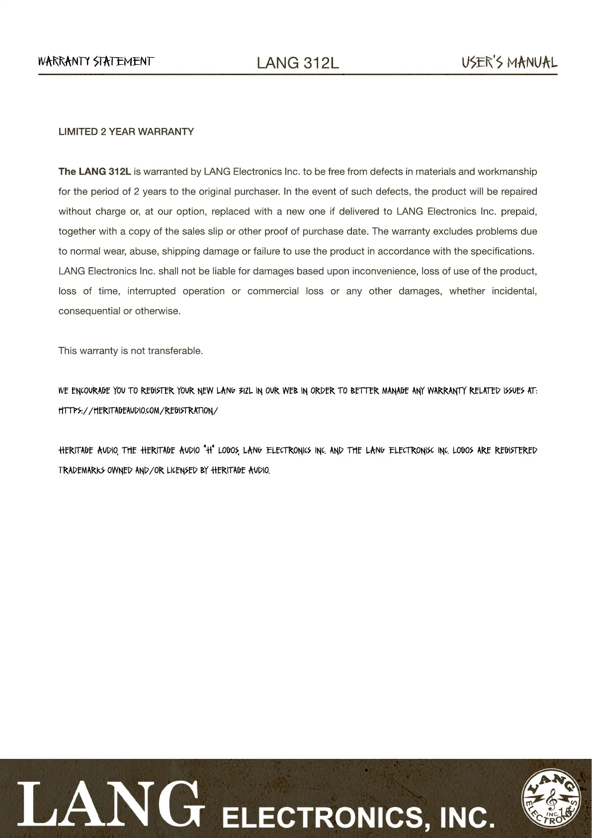 The LANG 312L is warranted by LANG Electronics Inc. to be free from defects in materials and workmanship