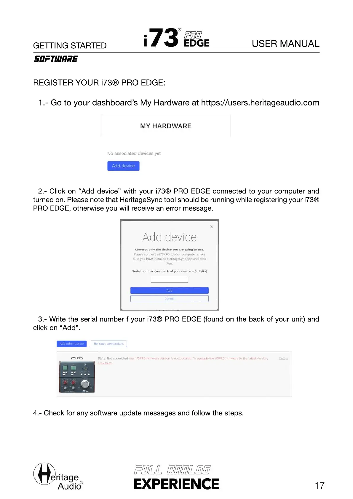 1.- Go to your dashboard’s My Hardware at https://users.heritageaudio.com