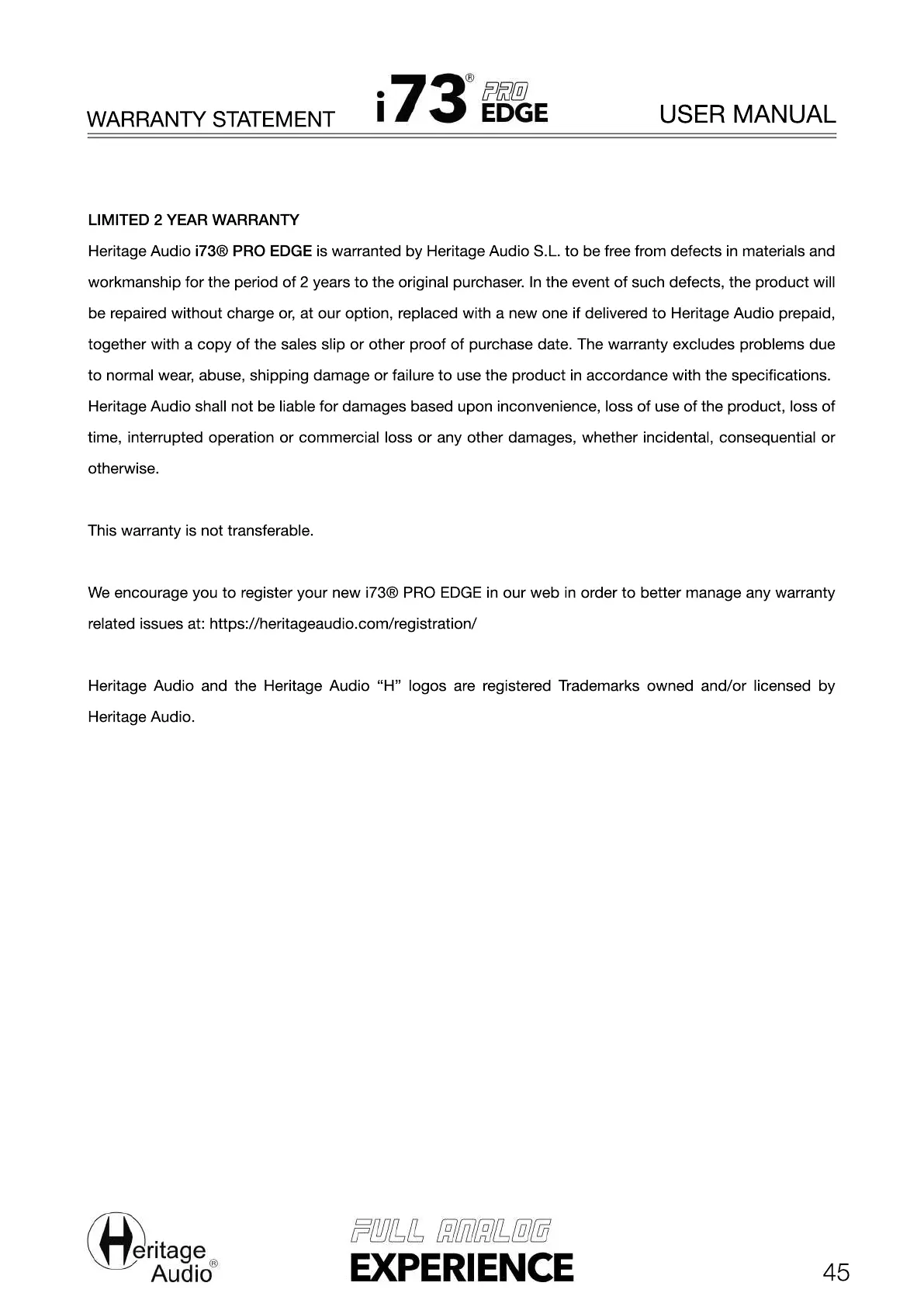 Heritage Audio i73® PRO EDGE is warranted by Heritage Audio S.L. to be free from defects in materials and