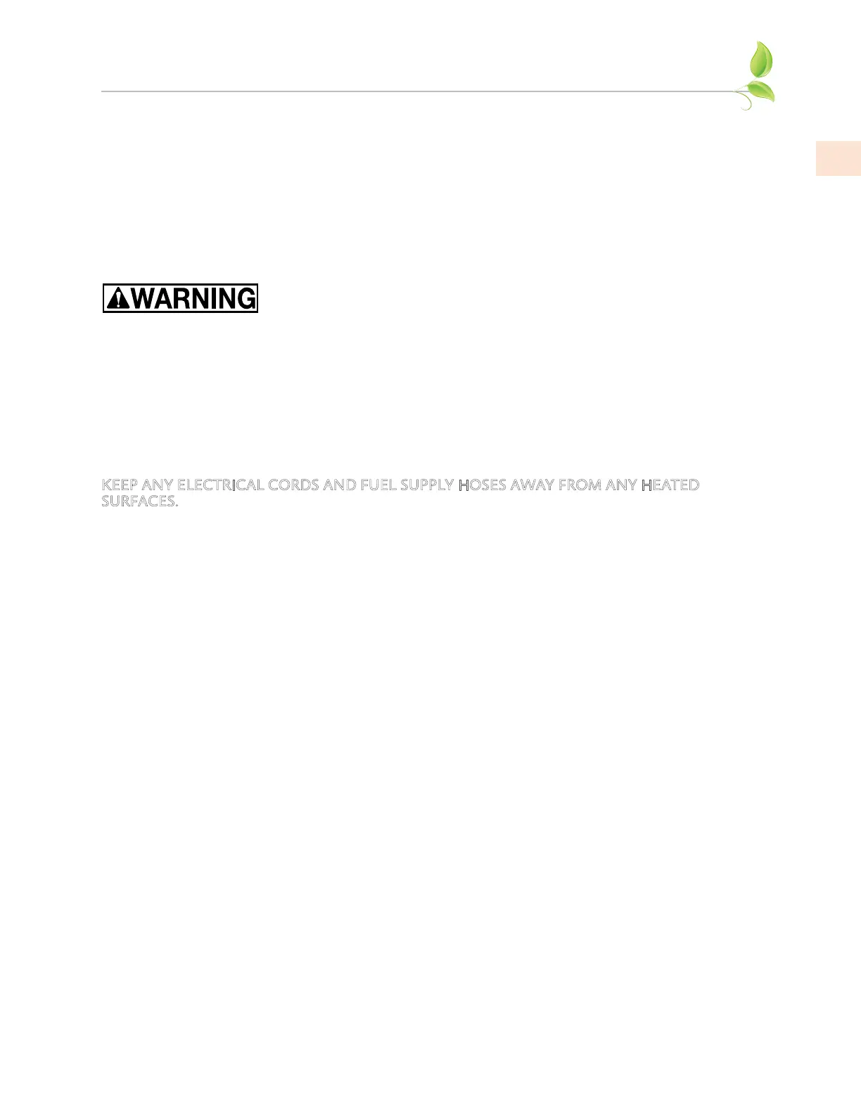 KEEP ANY ELECTRICAL CORDS AND FUEL SUPPLY HOSES AWAY FROM ANY HEATED