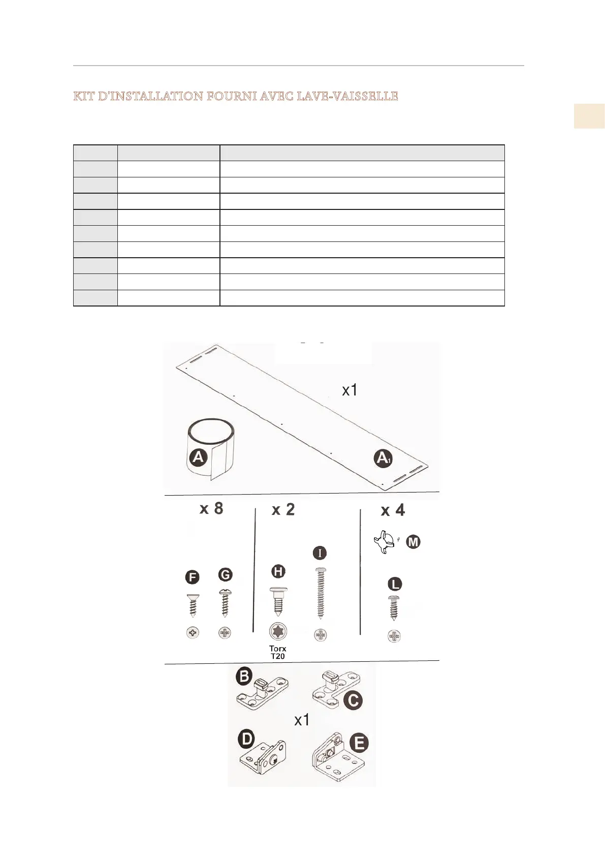 KIT D'INSTALLATION FOURNI AVEC LAVE-VAISSELLE