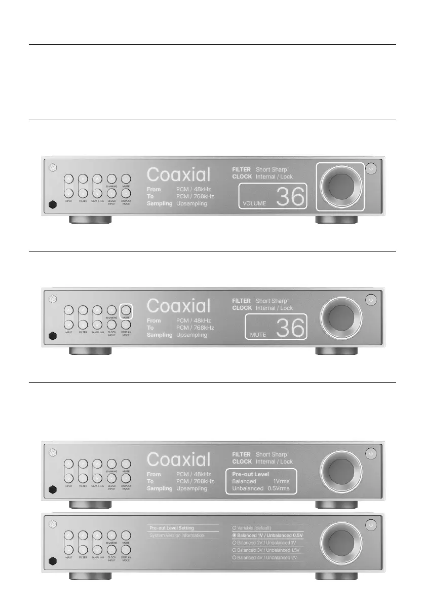 • You can set the pre-out output level from 1V to 9V via the MENU button on the remote control. When