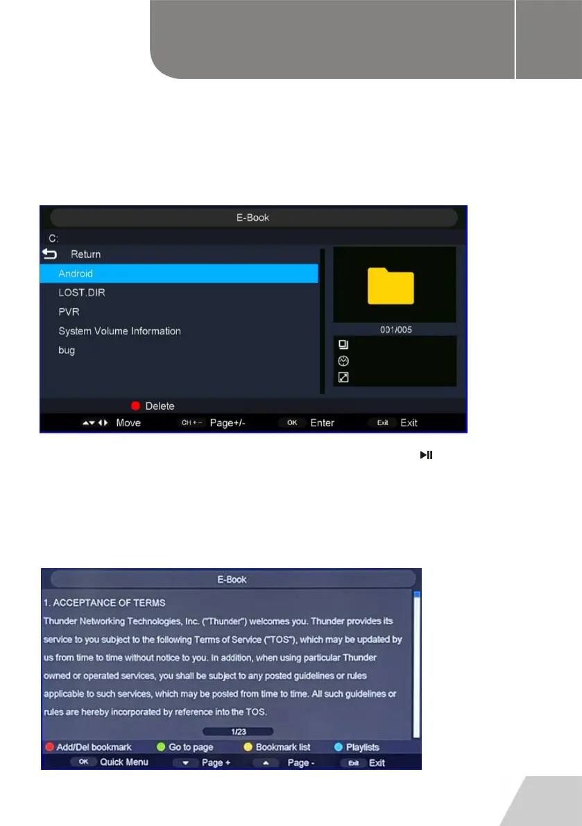 - Press the LEFT/RIGHT navigation button to select “E-Book” in the main menu and press