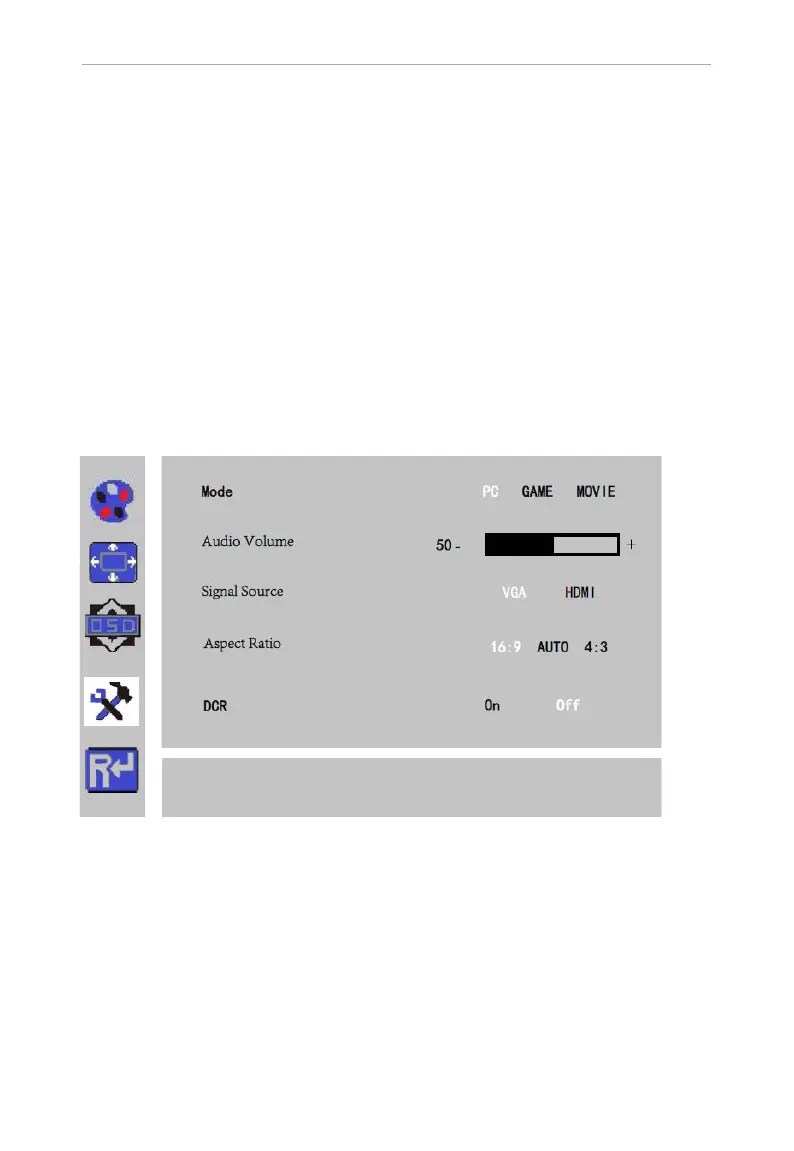 You can set Mode, Audio Volume, Signal Source, Aspect Ratio, DCR.