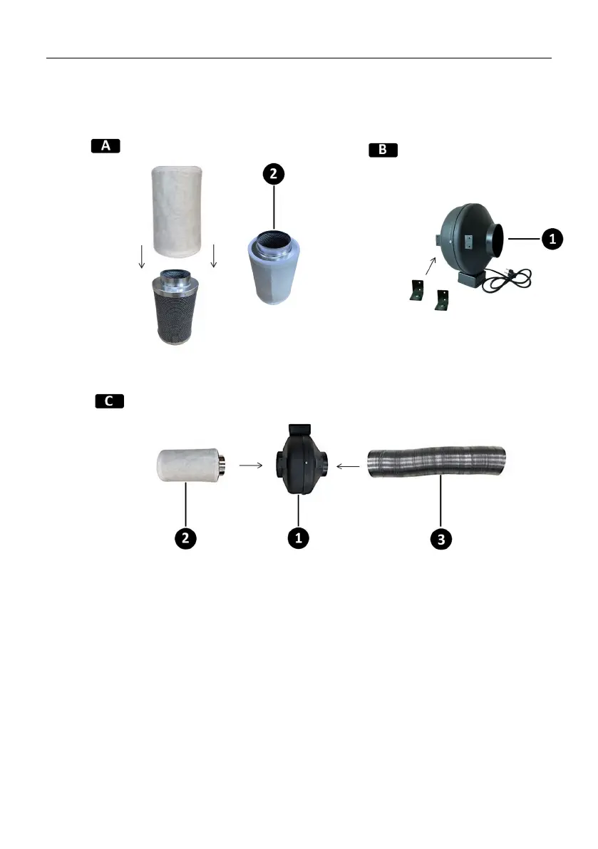 c) Szereljen be egy aktívszénszűrőt (2) (C) a ventilátor (1) légáramlási nyílásába.