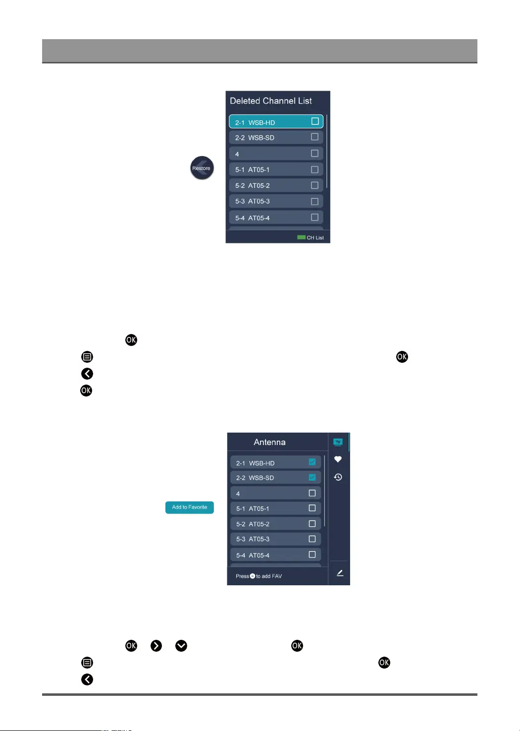 Press button, select the channel(s) you want to add to the favorite list by pressing button.