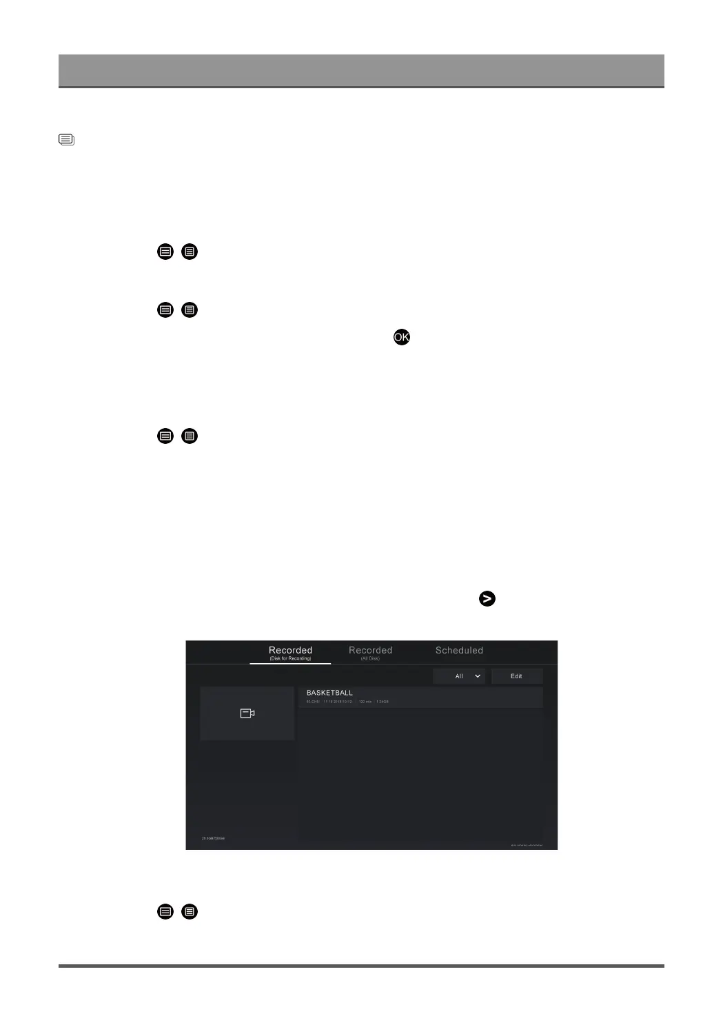 Select Edit, select a recorded programme in the recording list and press button to delete it.